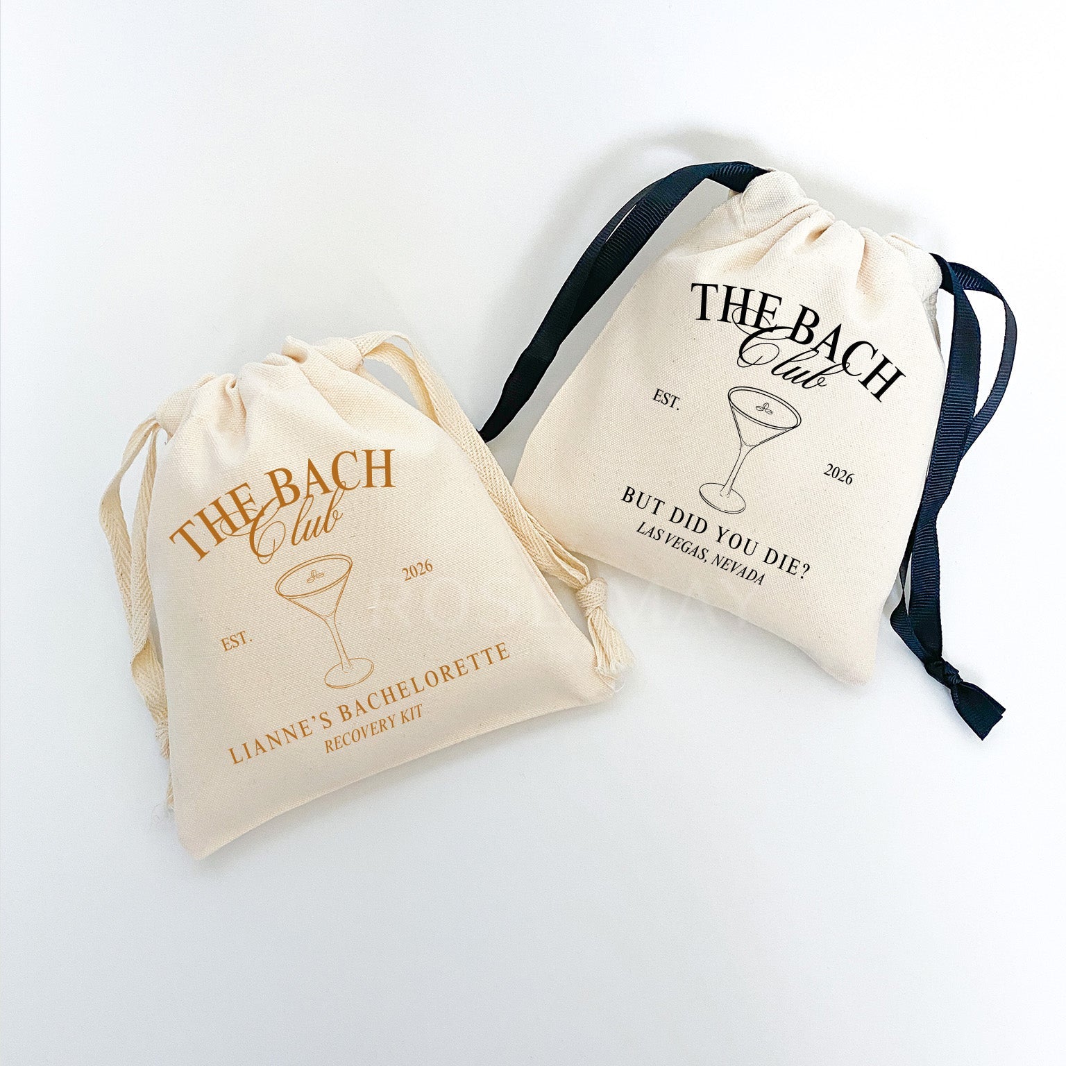 Get your party started with these recovery kits! Made with durable cotton canvas and your choice of natural or black drawstring ribbon, these bags can be personalized for bachelorette parties or wedding favors. Let the good times roll (and the drinks too)!